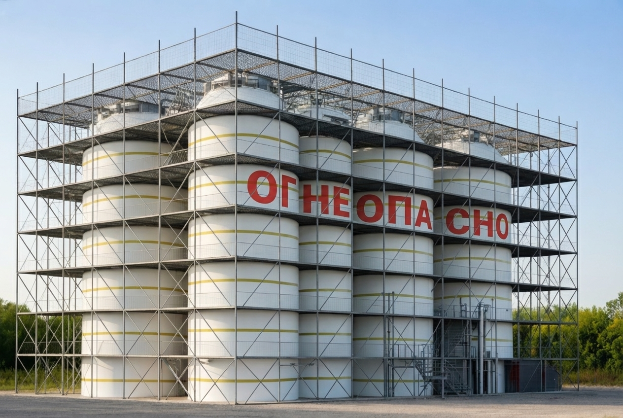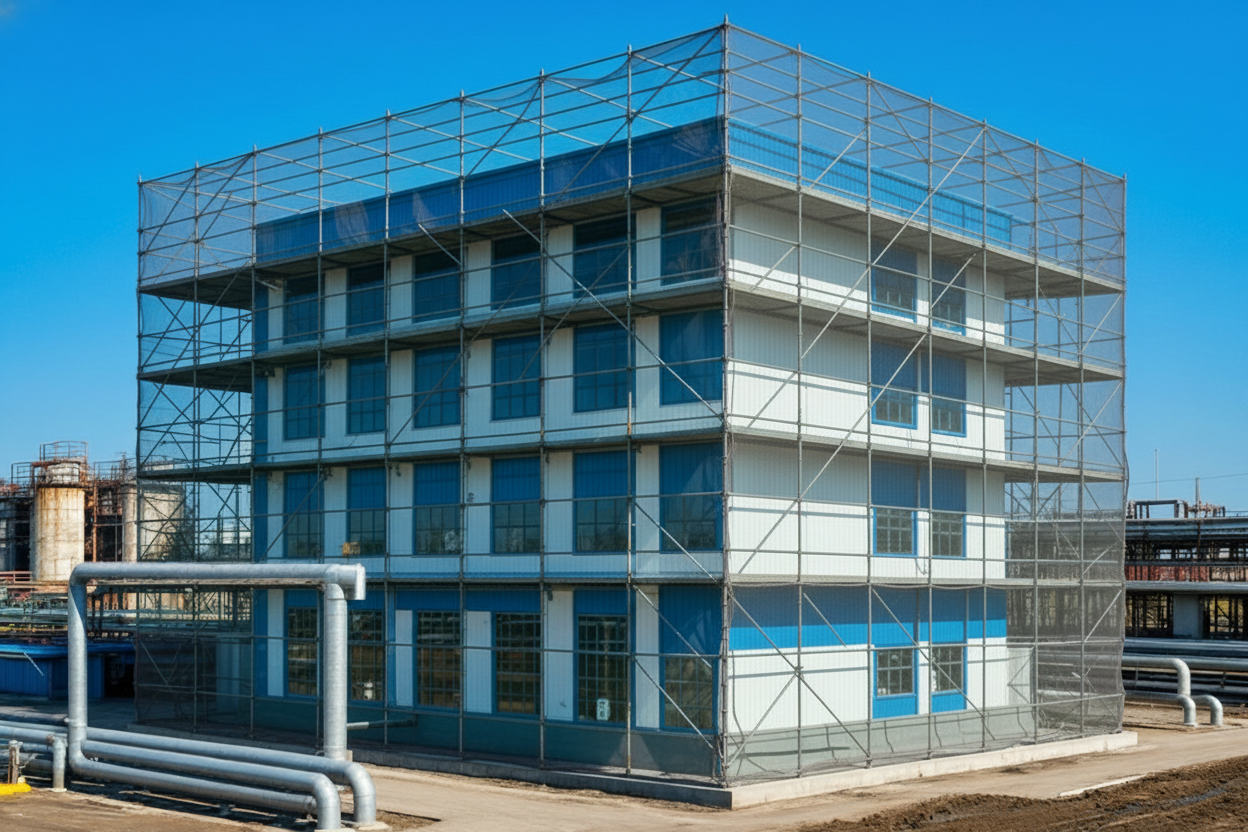 Строительные леса в качестве многофункциональной пассивной защиты от БПЛА. Охрана воздушной зоны над объектами повышенной важности, включая промышленные площадки, топливные хранилища и подстанции, эффективно обеспечивается строительными лесами с монтажом специальной барьерной сетки.