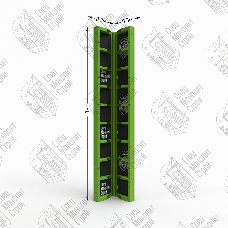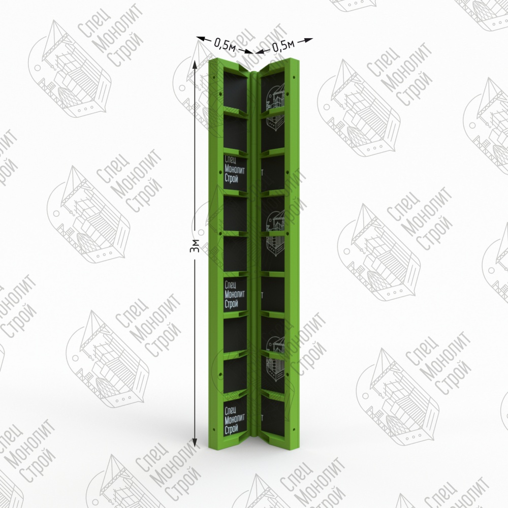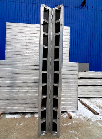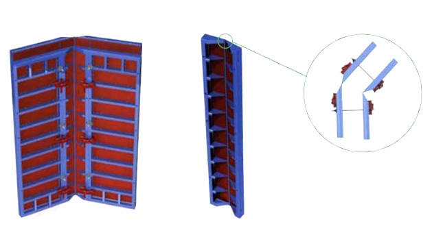 Наружный и внутренний шарнирные щиты монтируются в паре, соединяя линейные панели опалубки под требуемым углом. Регулируемое соединение позволяет точно выставить геометрию угла и надежно зафиксировать конструкцию перед бетонированием.