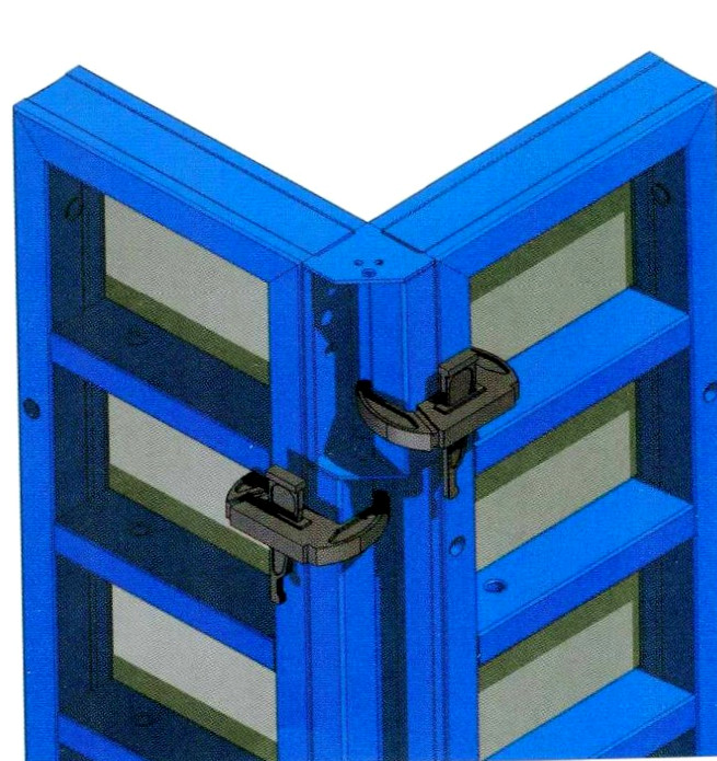 Фиксация углового элемента к линейным щитам осуществляется через торцевые ребра жесткости. Для этого используются стандартные замки опалубки (клиновые, винтовые или универсальные BFD). Рекомендуемое количество точек крепления на высоту 3 метра — не менее 3 замков на одну сторону стыка.