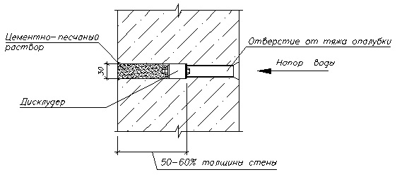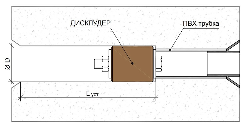 Ответ: Дисклудер Д 25/40 предназначен для герметизации отверстий диаметром 25–27 мм. Это стандартный размер отверстий, остающихся после удаления стяжных болтов в разборно-переставной опалубке. Перед установкой рекомендуется рассверлить отверстие до 27 мм и тщательно очистить его.